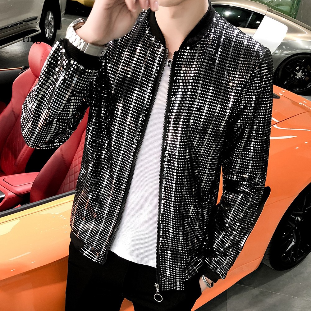 chỉ còn 303,010đ RNSE Men Shiny Sequins Long Sleeve Zip Pocket Nightclub Singer Jacket Slim Fit Coat